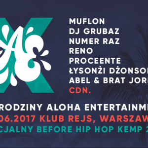 W sobotę 3 czerwca w klubie Rejs nad Wisłą wytwórnia Aloha Entertainment świętuje swoje X urodziny. Będzie to oficjalny before festiwalu Hip Hop Kemp 2017. Już o godziny 14 zapraszamy na warsztaty hip-hop. O godz. 19 startują się koncerty. Zagrają Reno, Abel & Brat Jordah, Proceente & Łysonżi Dżonson, Numer Raz, Muflon, Blady Kris, Zerotroskiss czyli Masia/Guova/MuzaMan/DJ Gugatch, Subarugang oraz goście specjalni. Afterparty rozkręcą DJ Grubaz…