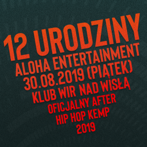 W piątek 30 sierpnia wytwórnia Aloha Entertainment świętuje 12. urodziny. Impreza będzie połączona z oficjalnym afterem festiwalu Hip Hop Kemp 2019. Wydarzenie uświetnią wyjątkowe występy oraz moc hip-hopowych atrakcji. Koncert wieczoru zagrają Proceente, Łysonżi Dżonson, Mały Esz oraz goście specjalni. Wcześniej na scenie pojawią się Johnny Slim oraz Yaki. Po północy afterparty rozkręcą DJ Anusz i DJ Beredson. Wstęp jest FREE! Świętuj razem z Alohą!…